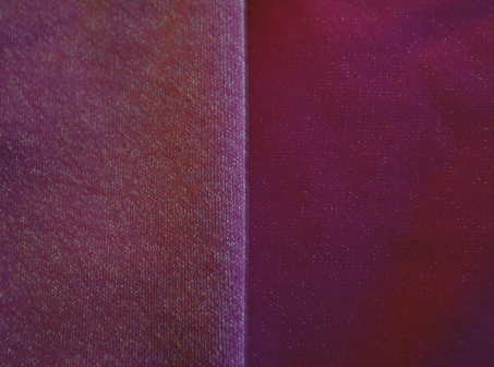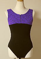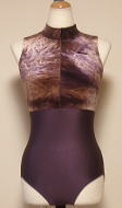 L-07(タートルネック) 前ファスナー・胸下切替あり (背中あきなし) 上下:オペロン¥4,950 ストレッチベロアトップ下オペロン¥5,500 *写真はストレッチベロアマーブル(クラッシュパープル/茶系)切り替え下:グレイッシュパープル |